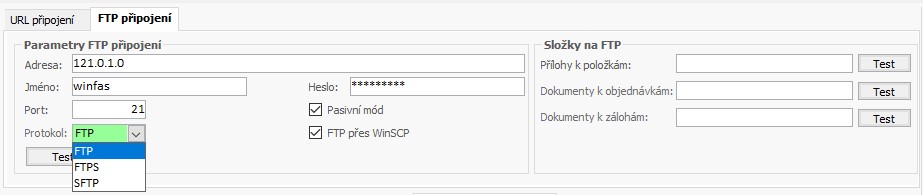 - funkčnost protokolu a dostupnost na FTP složek je možné prověřit pomocí tlačítka Test