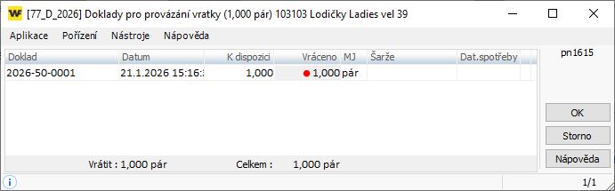- Do množství napíšeme vrácené množství mínusem a objeví se nám následující tabulka