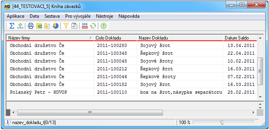 Pomocí této funkce můžete vytvořit vzorec pro filtrování tabulky. Podržte klávesu SHIFT a klepněte levým tlačítkem myši do nadpisu sloupce, za který chcete filtrovat. Ze seznamu vyberte požadovanou funkci (např. název dokladu obsahuje slovo šrot). V levém dolním rohu se objeví pole pro zadání hodnoty a popis o jakou funkci se jedná (v tomto případě like ). Zadejte požadovanou hodnotu a potvrďte klávesou enter. Tabulka se vyfiltruje. Že je filtr aktivní poznáte podle červeně podtržené hlavička tabulky.