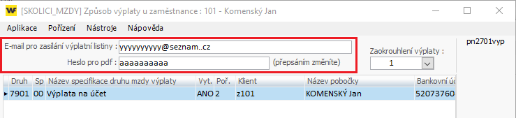 - Zvolte tlačítko Výplata a doplňte údaje pro odesílání výplatní listiny e-mailem: