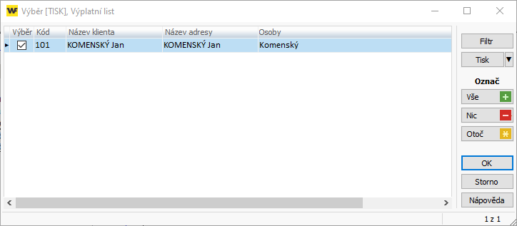- V dalším kroku můžete některé osoby vyřadit z odesílání (odstraněním zatržítka). Potvrďte tlačítkem OK. Pro tisk zůstanou pouze neodeslané výplatní listiny.