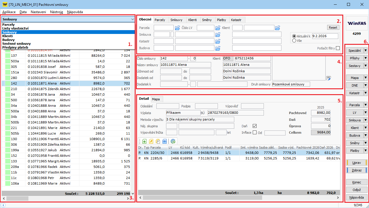 Hlavní aplikace modulu Pozemky, která umožňuje z jednoho místa provádět veškeré operace týkající se pachtovních smluv: