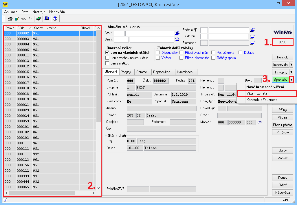 - 2. Ze seznamu čísel vyberte zvíře, kterému chcete pořídit vážení.